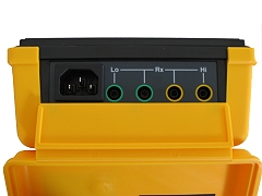 When the yellow protective cover of the electric resistance tester is removed, you will see the cable connection block. Adapter is included to connect to the mains and also there are four grafts (2 green and 2 yellow grafts) to connect control cables. This tester has a double tap. Connections lay out (according to the function: ground meters) can be found at user manual (see above).