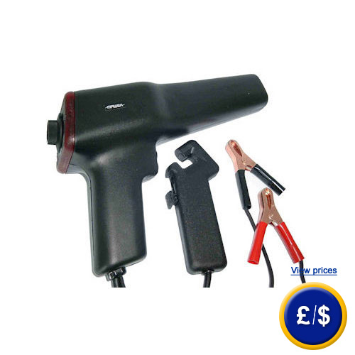 This stroboscope light is connected via an inductive clamp to the engine battery of cars that run by Otto engines. The stroboscope light is the ideal device to easily adjust the inductive of an engine. It has to be said that this is often necessary for older engines since a too high pre-ignition leads to the engine over-heating under full throttle. The counterpart is a too low pre-ignition, which leads to a much too low engine power at lower rotational speeds. Thus, a stroboscope light helps in adjusting the correct ignition in order to achieve maximal engine power at minimal heat. Thus, a stroboscope help to find the optimal ignition point, and if necessary the ignition can be adjusted afterwards to reach the perfect ignition point. The stroboscope gets its power from the engine motor. The clamp can be attached to the ignition wire between ignition plug and ignition coil. An overview of all stroboscopes in our assortment can be found
