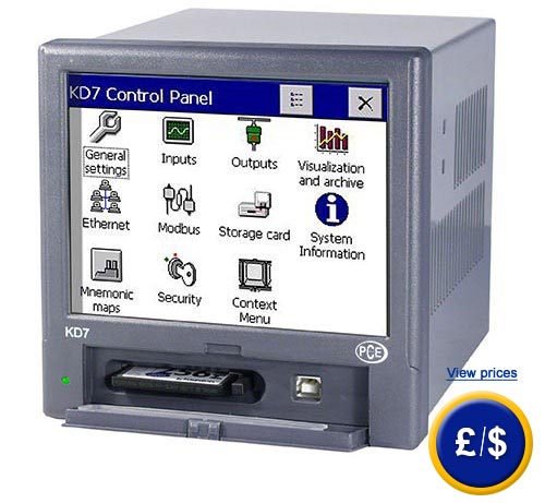 PCE-KD7 digital recorder to process voltage, current, thermo-elements, resistance / with alarm function / 5,7" touch-display/ records in CF card up to 4 GB/ mathematical functions / several digital interfaces: Enthernet, USB 1.1, RS-485, RS-232 / up to 12 channels