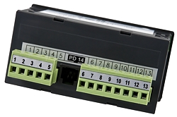 The PCE-N20T temperature indicator is electrically connected by a screw terminal placed at the backside. On the PCE-N20T temperature indicator case you will find an overview of all the connections to allow a quick and safe installation in situ. The interface (PD14) of the PCE-N20T temperature indicator is also placed here. It is a RJ-11 connector. The programming adapter is used with the USB port. |